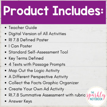 Teaching your 7th grade students to identify and evaluate arguments? This 42 page mini unit includes all you need to check for understanding of RI.7.8. With this standards-based resource, students will have the opportunity to read 4 texts and use passage prompts to cite evidence and analyze each selection. Students will complete an activity for each text. This resource includes everything you need to check for understanding, including a summative assessment with a rubric. All answer keys are also included, as well as a teacher guide breaking down the standard into learning targets and Depth of Knowledge (DOK) stages.